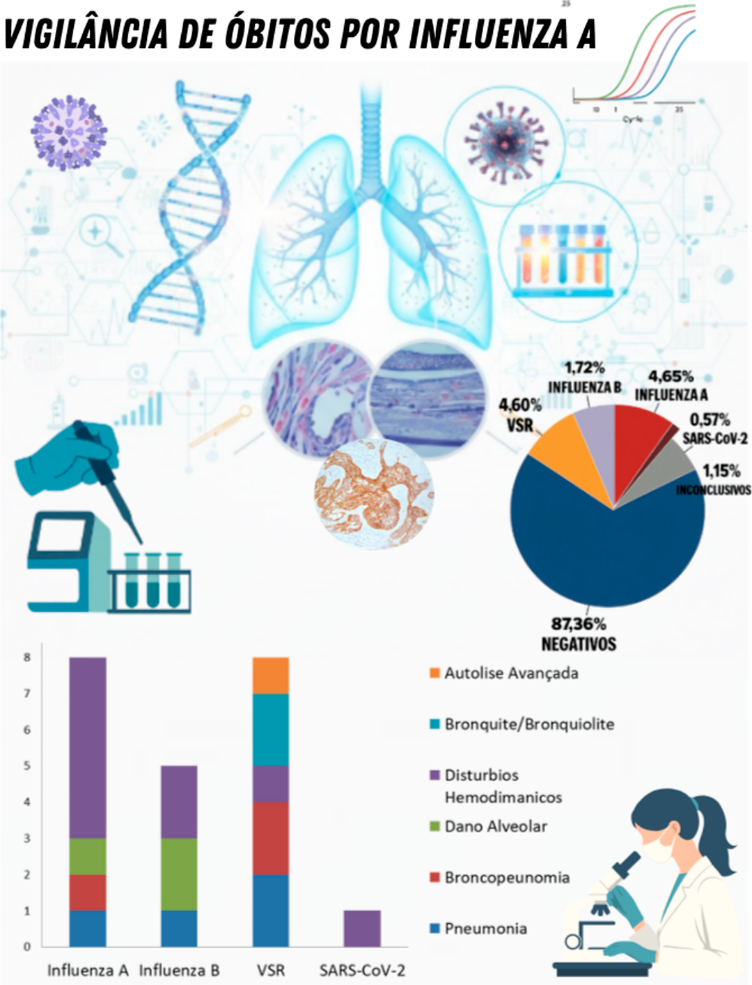 O estudo buscou padronizar a RT-qPCR multiplex para detectar Influenza A em tecidos fixados em formalina e incluídos em parafina (FFIP) de casos suspeitos de SRAG. Foram avaliadas 174 amostras com protocolo de extração adaptado e ensaio comercial para vírus respiratórios. A positividade foi de 4,6% para Influenza A, além de achados de VSR, Influenza B e SARS-CoV-2. A técnica mostrou-se viável e robusta para diagnóstico diferencial em FFIP, complementando a imunohistoquímica. Conclui-se que a RT-qPCR multiplex em amostras post mortem pode qualificar a vigilância etiológica de óbitos e apoiar decisões em saúde pública.