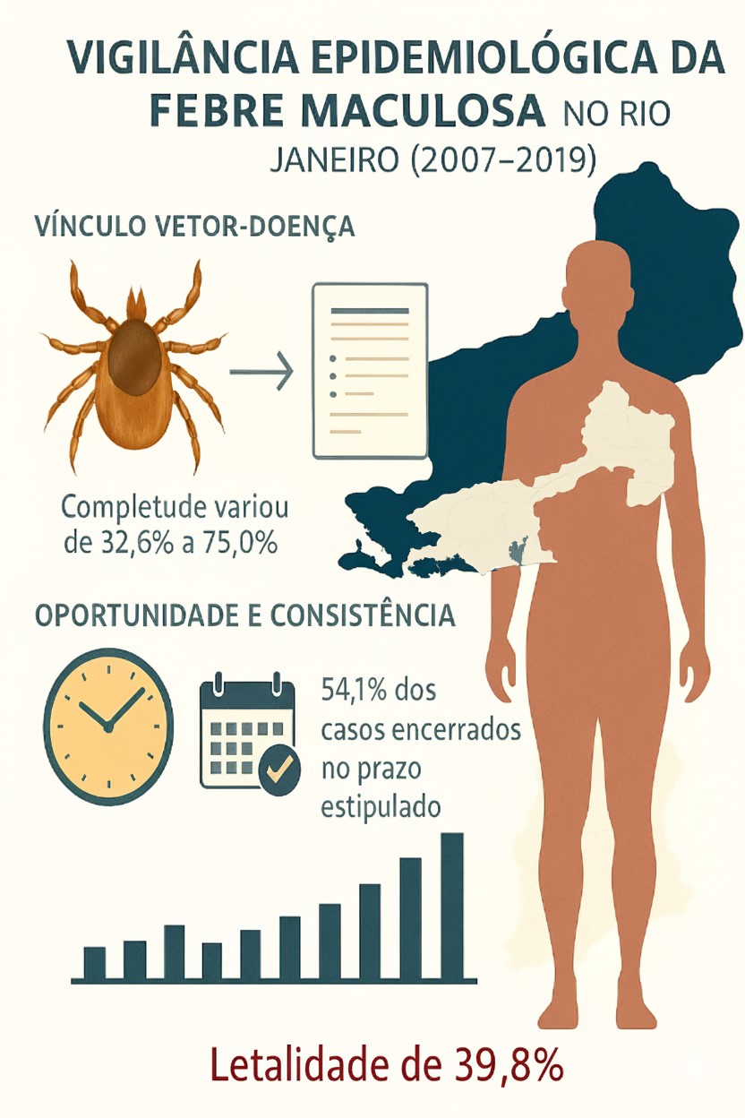 Este estudo teve como objetivo avaliar a qualidade dos dados de fichas de investigação sobre febre maculosa notificados no Sistema de Informação de Agravos de Notificação (SINAN) no estado do Rio de Janeiro entre 2007 e 2019. Trata-se de um estudo epidemiológico descritivo e transversal de 1.403 notificações de casos humanos suspeitos de febre maculosa em que foram analisados os atributos de qualidade: completude (proporção de campos preenchidos), oportunidade (tempo entre início dos sintomas e notificação) e consistência (coerência entre variáveis relacionadas). Do total de notificações, 176 (12,5%) foram confirmadas, 946 (67,1%) descartadas, 131 (9,3%) inconclusivas e 154 (11,1%) sem informação (vazias/ignoradas). A completude variou entre 32,6% (evolução clínica) e 75,0% (presença de vetor). A oportunidade mostrou que 54,1% dos casos foram encerrados no prazo, mas apenas 47,1% das hospitalizações foram notificadas em 24h. A letalidade foi de 39,8%, com 31,1% de óbitos dentre casos confirmados com exposição ao vetor. A qualidade dos dados apresenta deficiências significativas que comprometem a vigilância efetiva da febre maculosa no Rio de Janeiro, demandando melhorias na completude, oportunidade e integração dos sistemas de informação.