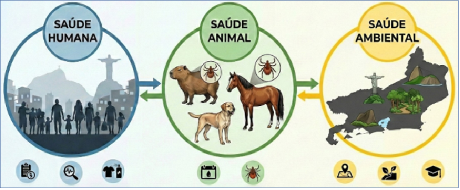 A febre maculosa no Brasil representa um modelo paradigmático de doença emergente associada às transformações ambientais e à interface entre sistemas humanos e naturais. O artigo tem por objetivo analisar os aspectos epidemiológicos da febre maculosa no estado do Rio de Janeiro entre 2007 e 2019, avaliando a relação entre presença de vetores, hospedeiros animais ou amplificadores e características ambientais sob a perspectiva Uma Só Saúde. Estudo epidemiológico descritivo de 1.403 notificações de febre maculosa, obtidas por meio de acesso aberto à plataforma DATASUS, com análise da distribuição espacial, temporal e das características epidemiológicas. Foram avaliadas as associações entre presença de vetores, evolução clínica e características ambientais das áreas de ocorrência. Entre os 176 casos confirmados, 75,0% apresentaram exposição a carrapatos. A letalidade foi significativamente maior entre casos com presença de vetor (31,1%). Observou-se concentração de casos em áreas de interface urbano silvestre, com predomínio no sexo masculino (65,3%) e faixa etária de 20-59 anos (58,5%). A sazonalidade mostrou picos entre maio e outubro, corroborando com a literatura. A febre maculosa no Rio de Janeiro apresenta padrão epidemiológico complexo, influenciado pela fragmentação da Mata Atlântica, urbanização e mudanças climáticas. A abordagem Uma Só Saúde é fundamental para compreender e controlar.